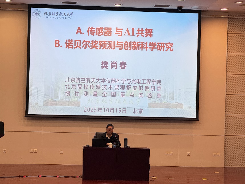 在学术报告环节,首先由樊尚春教授作主题为《传感器与AI共舞》和《诺贝尔奖预测与创新科学研究》的报告。樊尚春介绍了传感器在解决世界科技前沿问题,服务国民经济、国家重大需求以及人民生命健康领域发挥的重要作用,结合典型实例讲述传感器的技术内涵、应用特点和发展趋势等,提出了传感器未来发展的重点领域。樊尚春还介绍了开展预测诺贝尔自然奖的相关教学科研实践,并给出开展创新科研的建议。